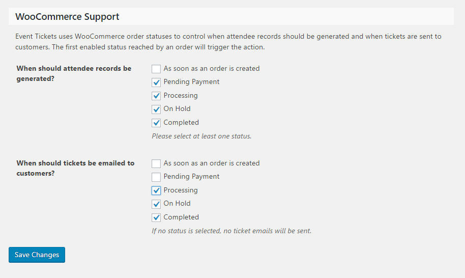 A common sequence in the life cycle of an order would be for it to start at Pending Payment before progressing to Completed. In such a scenario, these settings would result in the attendee record being generated first and the tickets being emailed later, once payment has been confirmed.